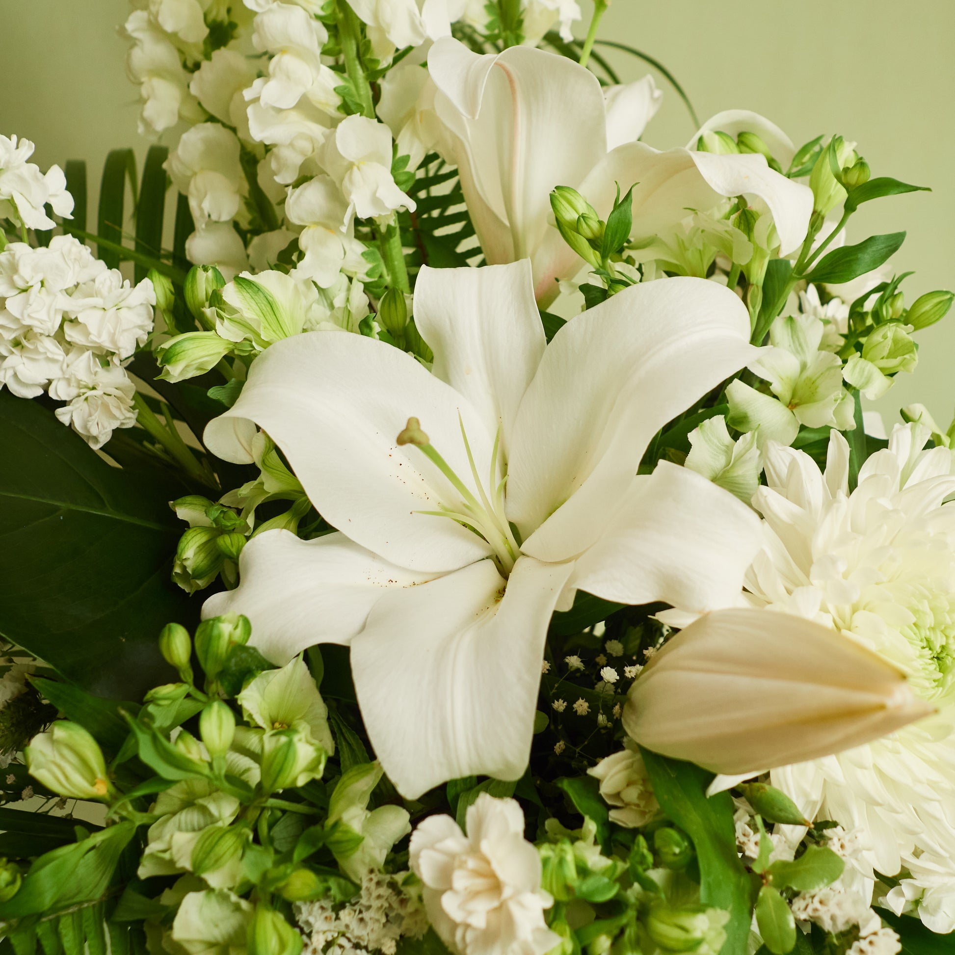 White lilies balanced with spires of matthiola or similar and framed with elegant greenery, arranged in floral foam for longevity and structure.