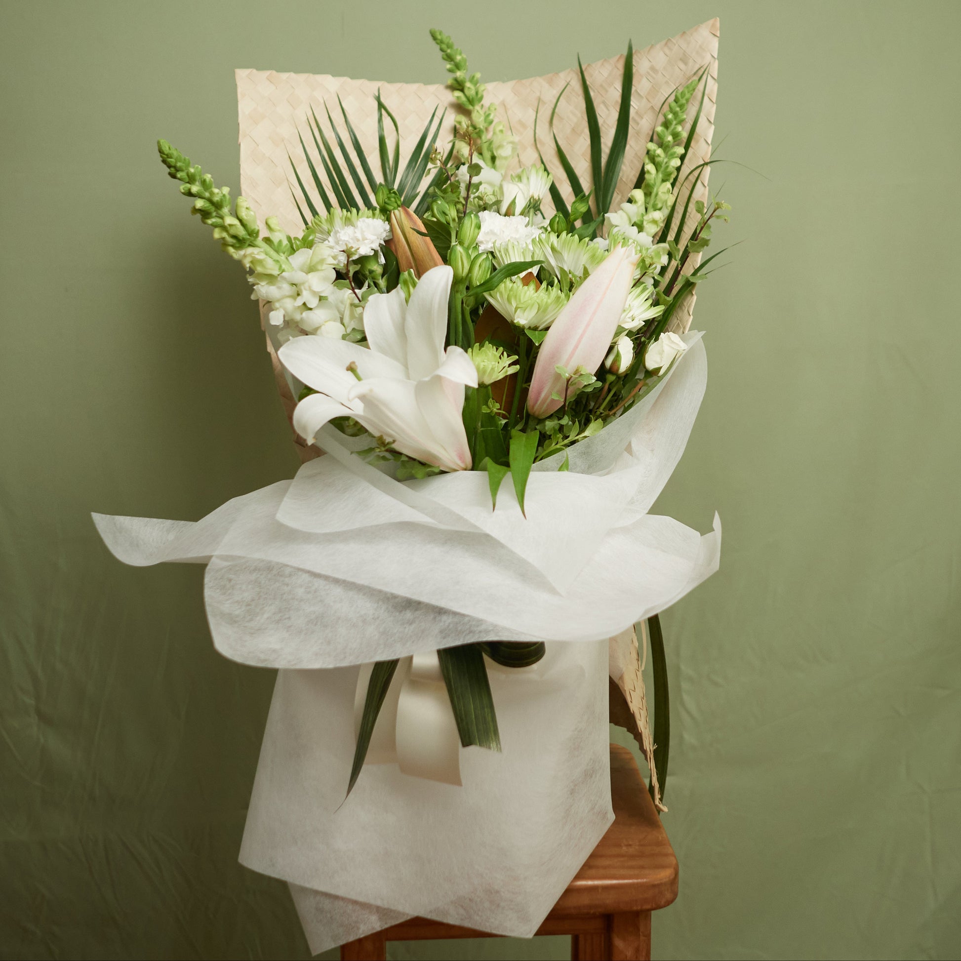 A crisp and elegant bouquet of whites and cream flowers arranged in a water-filled box wrapped in a flax mat.